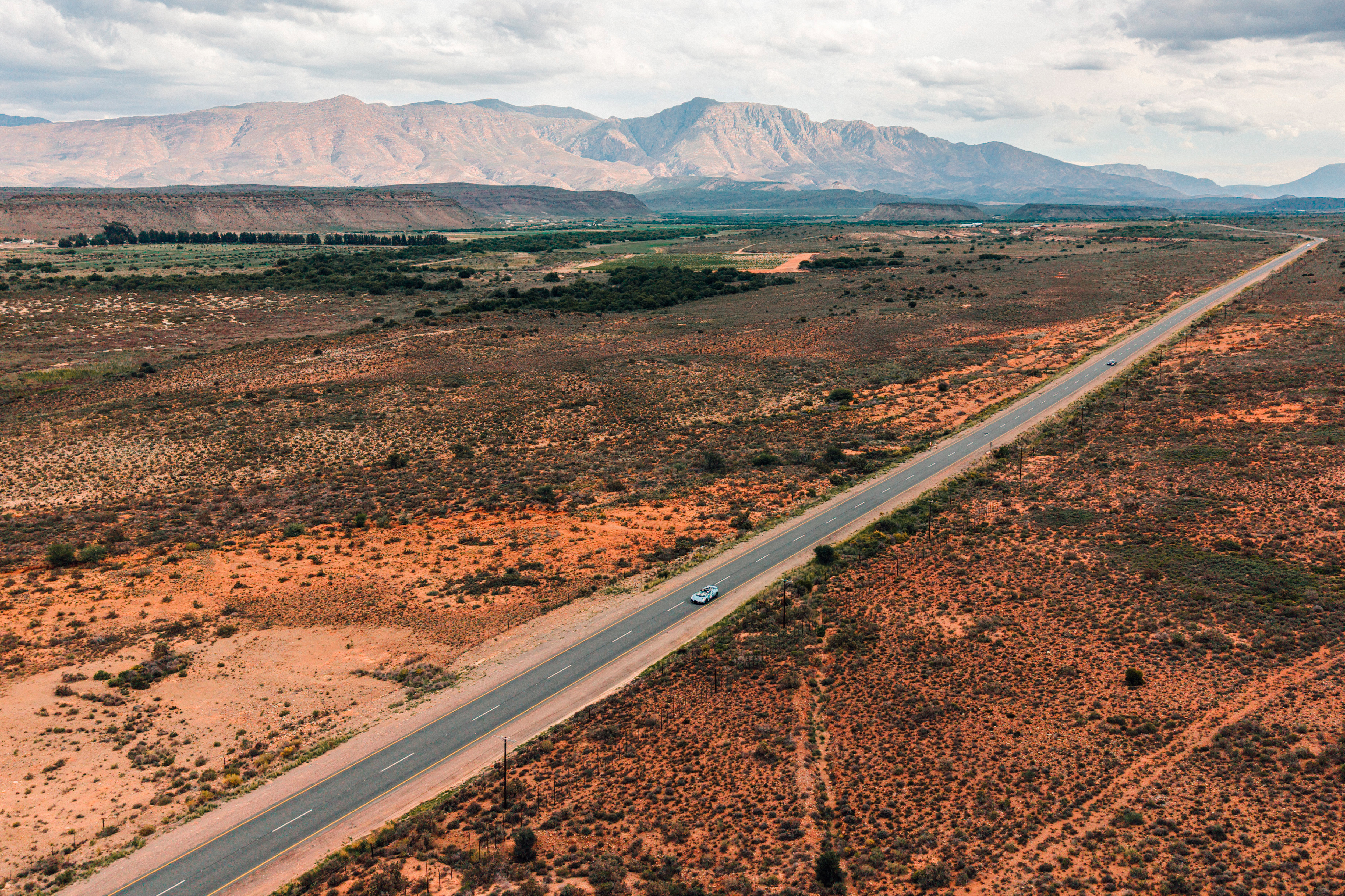 De retour au volant de leurs hypersportives, les participants ont poursuivi leur route à travers les paysages saisissants du Klein Karoo. Cette vaste vallée semi-aride révélait une toute autre facette du pays : d’imposantes chaînes de montagnes laissant place à des horizons infinis et à des routes isolées, ponctuées de petits villages plein de caractère et de cafés semblant suspendus dans le temps, disséminés au cœur d’un décor sauvage s’étendant à perte de vue.